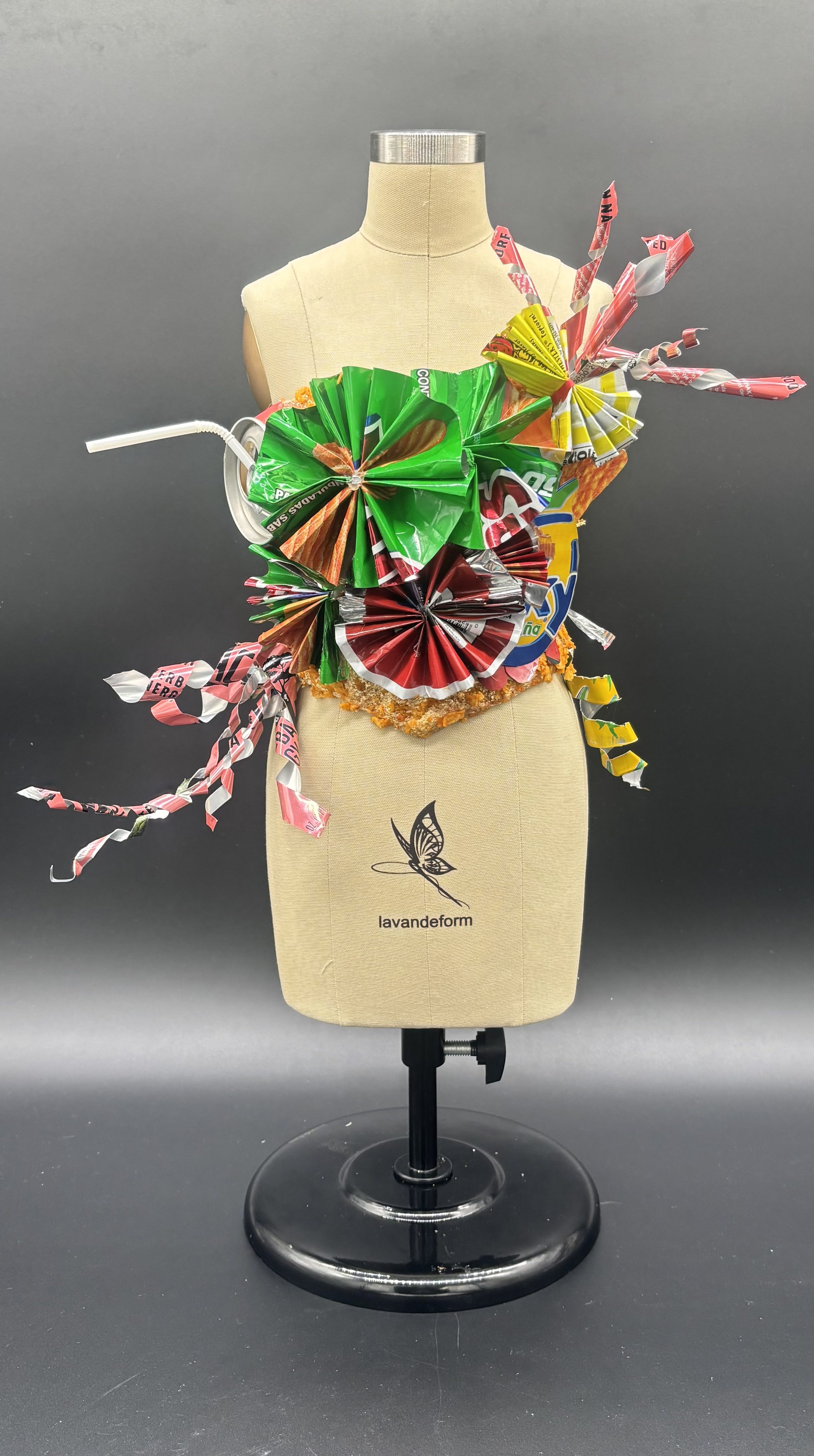 My corset titled “Trashumante” is a Spanish word that translates to “migratory” in English. This piece explores topics regarding pollution of homelands in Latin America and migration. I went in with the intention of recycling trash from both my parent’s homeland and my own. Some of the products I used in this sculpture are imports from Guatemala and other Latin American countries. These snack bags and cans are bitter sweet memories to me as I grew up consuming them as a child. I used to go down to my local recycling shop with my parents after garnering trash in exchange for money.
